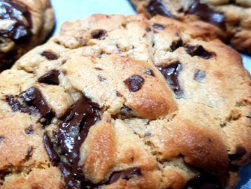 Giant, ultra thick new york cookies with crisp edges, a gooey molten center, and loaded with delicious rich chocolate chunks.